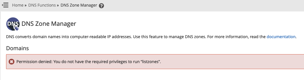 You may receive the following error when accessing DNS Zone Manager as a reseller that does not have the required privilege.